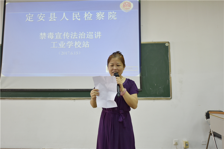定安县检察院检察长陈耿武表示,预防和减少未成年人违法犯罪,是我们社会共同的责任,也是检察机关的职责和任务。检察机关将加强与我校的协作配合,认真贯彻落实未成年人法制教育工作的部署和要求,在县委、省院的坚强领导下,以此次活动为契机,进一步推动未成年人法制教育和维权工作社会化,努力构建全社会关注、齐抓共管的未成年人权益保护工作格局。  李敏校长致辞  定安县检察院检察长陈耿武致辞  法制教育基地揭牌  李呈娇副校长主持禁毒教育讲座  学生参与互动