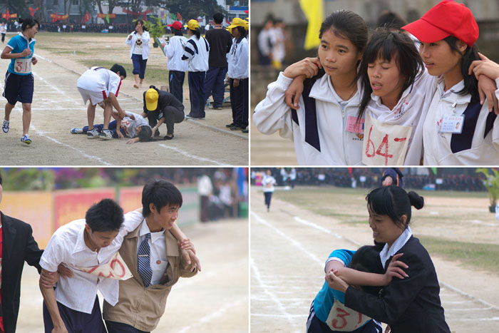 九点整,赛场上准时响起了比赛的枪声。本届田径运动会按年级分为A组(06级中专)、B组(07级中专)、C组(08级中专)、D(教职工)组。径赛项目有100米、200米、400米、800米、1500米、3000米,接力分别有男子和女子4×100米、ABC组男女混合8×400米、D组男女混合8×100米;田赛项目有跳高、跳远、三级跳远、铅球、铁饼等。